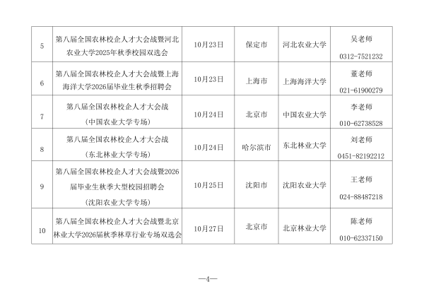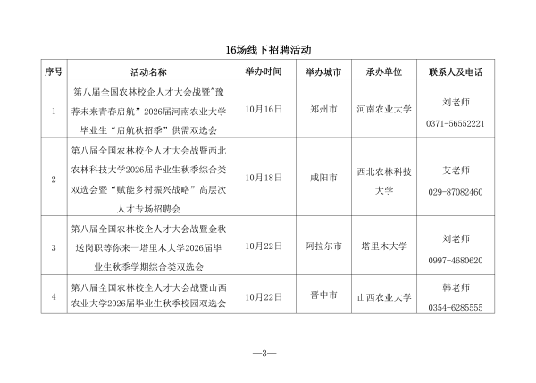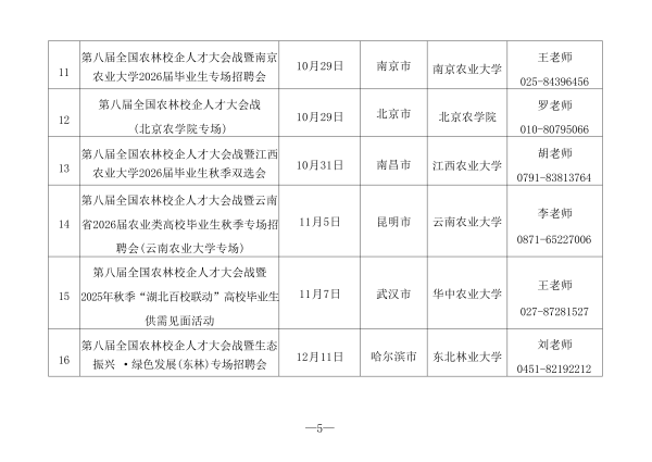 (二)举办线下校园招聘活动。2025年10月16日至12月11日,在北京、南京、武汉、西安等城市举办“第八届全国农林校企人才大会战系列专场招聘活动”。汇集农林行业用人单位优质岗位资源,助力行业人才和企业精准对接。