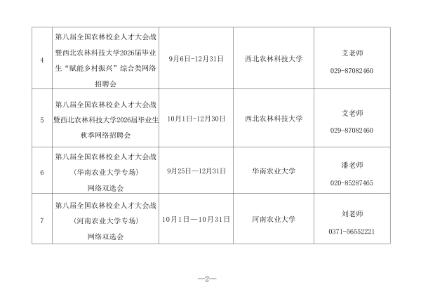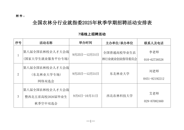 (一)举办专场招聘线上活动。即日起至12月31日,在国家大学生就业服务平台(https://www.ncss.cn)举办“全国农林行业面向2026届高校毕业生秋季专场招聘会”,集中发布全国农林行业用人单位招聘信息,促进高校毕业生与用人单位供需精准对接。
